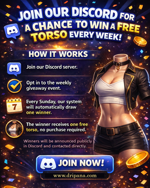 Each giveaway awards one (1) Dripana torso. The exact model and value will be determined by community vote. Approximate retail value ranges from USD $500 to $1,000. Prize is non-transferable and cannot be exchanged for cash or other products.